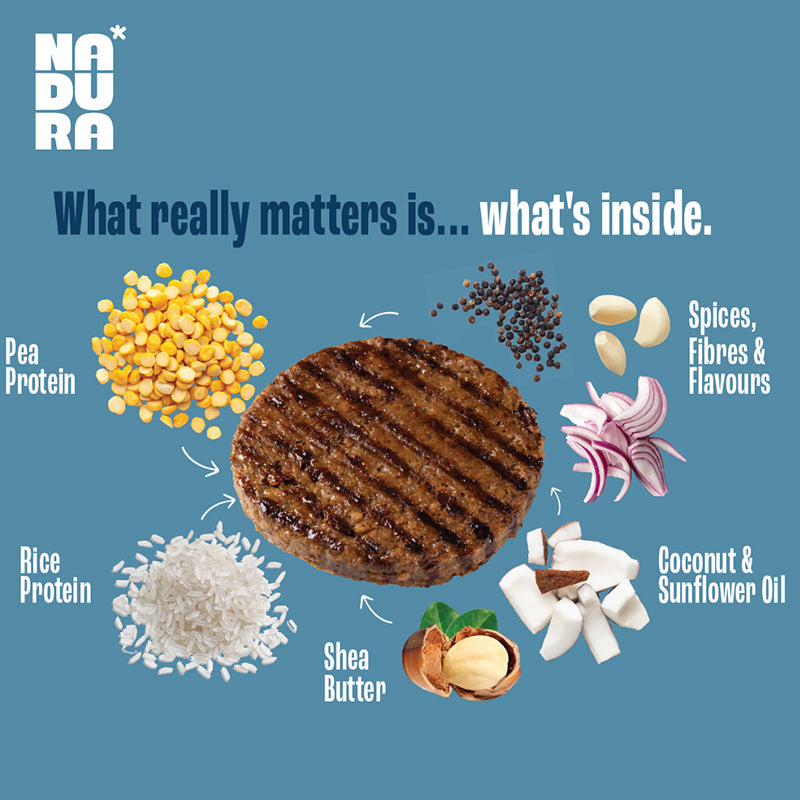 Nadura* high protein meat-free burgers can be defrosted, reshaped, and re-seasoned to create meatballs, kebabs, meatloaf, and whatever your imagination desires.
