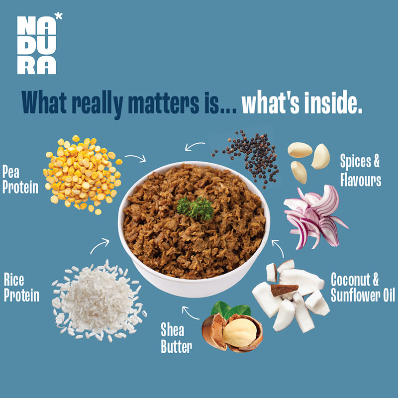 Nadura* plant-based mince is free of soy, gluten and GMOs. Offering a meaty texture with savoury umami flavours, it can replace beef, mutton or lamb mince in pastas, pies, wraps, shawarma, nachos, stir fry, keema and much more.